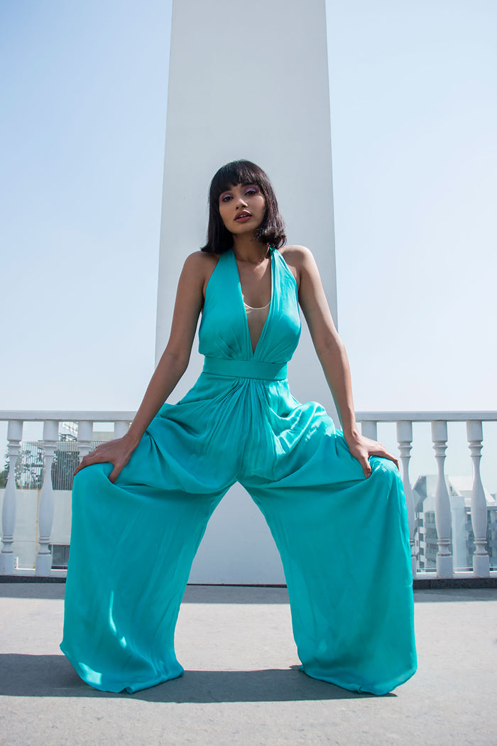 Claire Flush Blue Drape Gown With Full Sleeves And Back Detailing