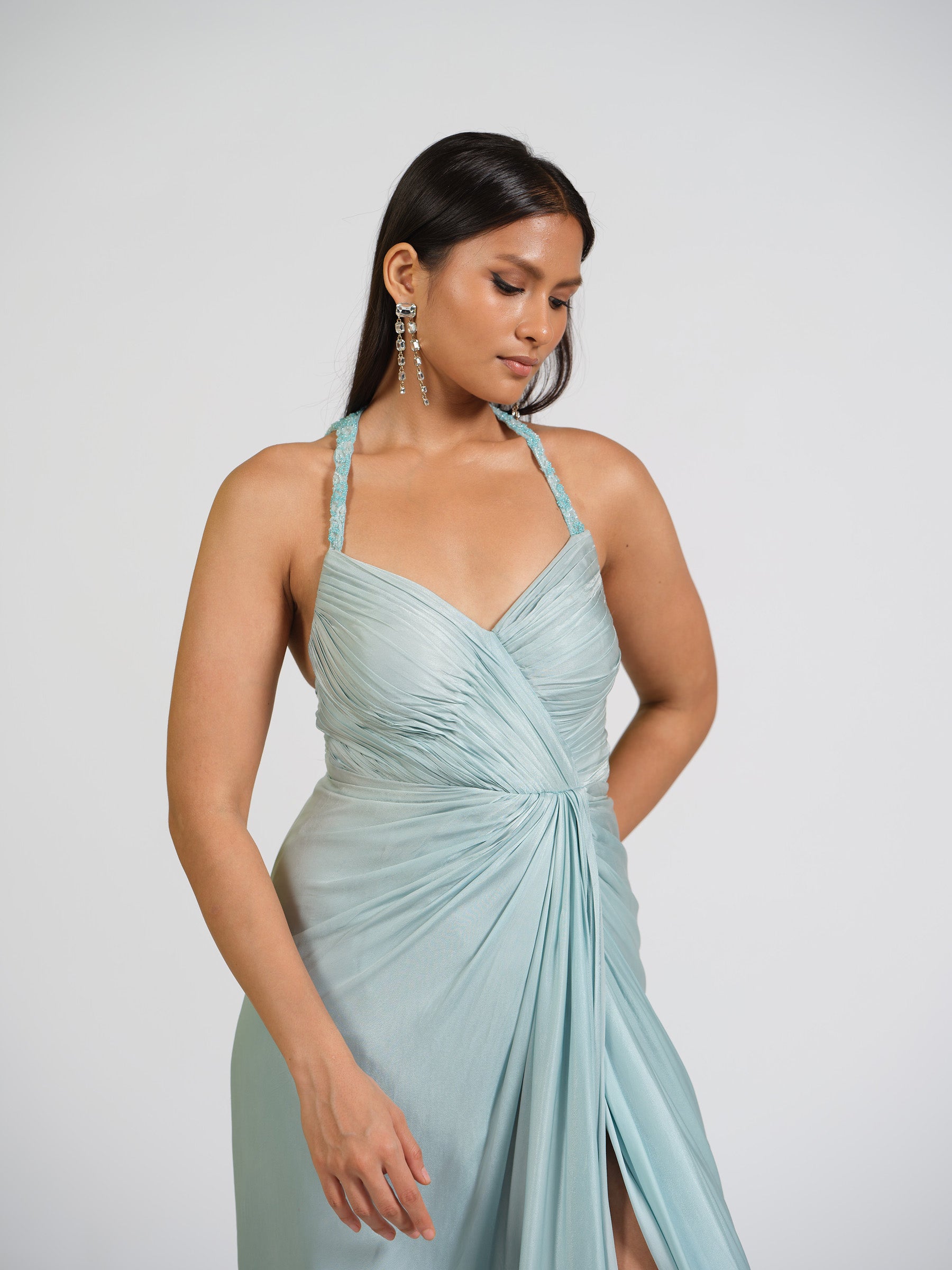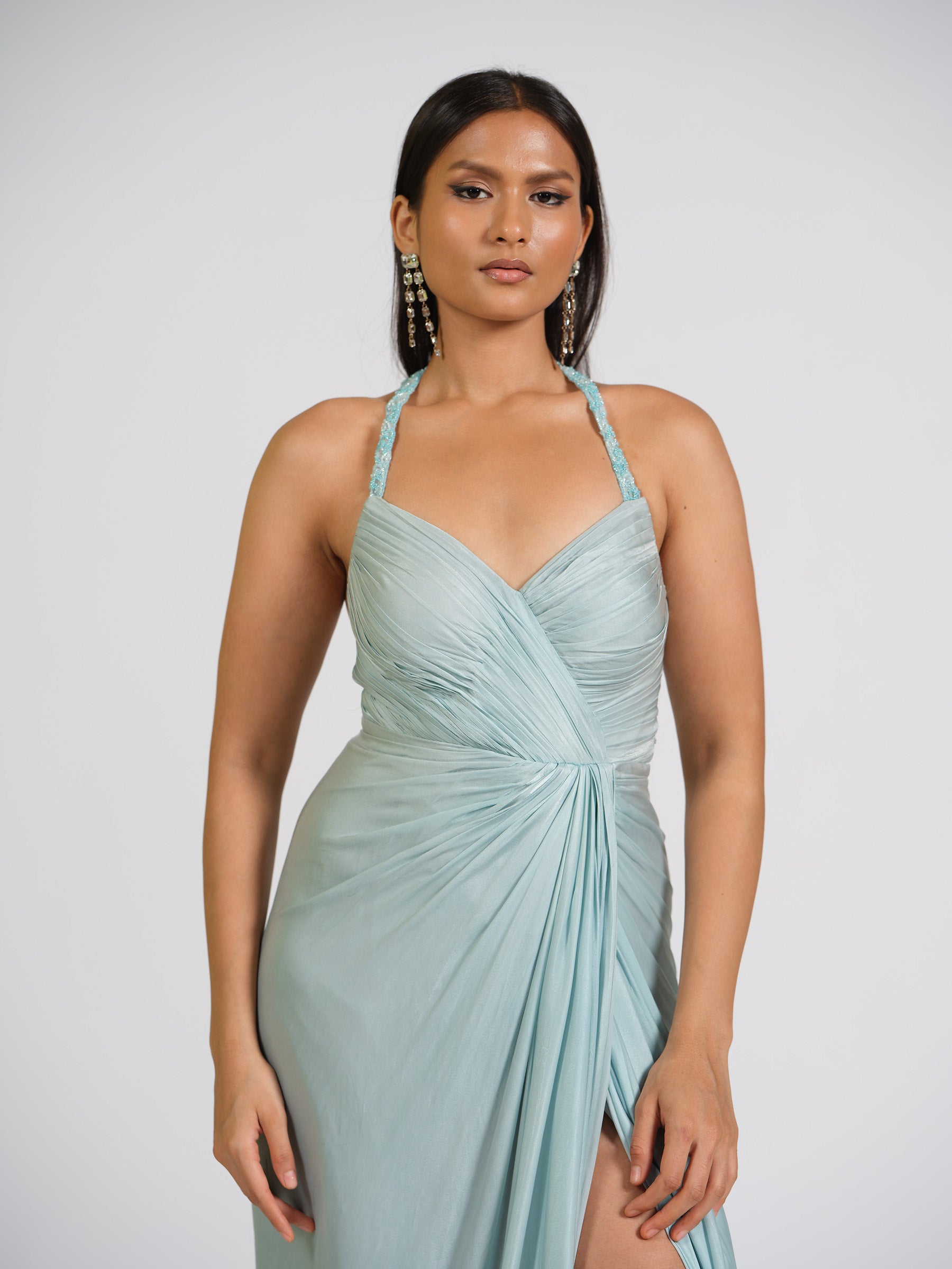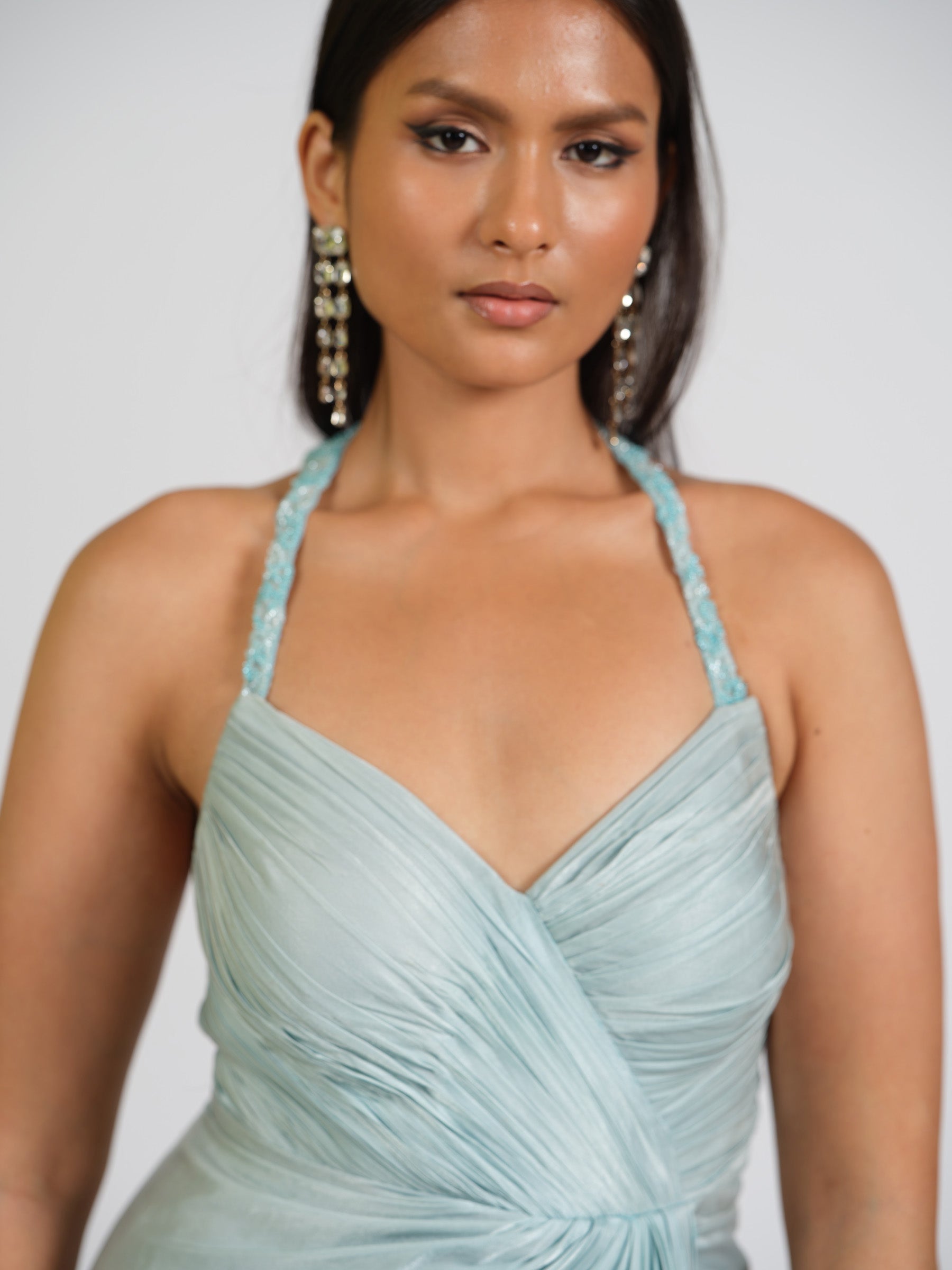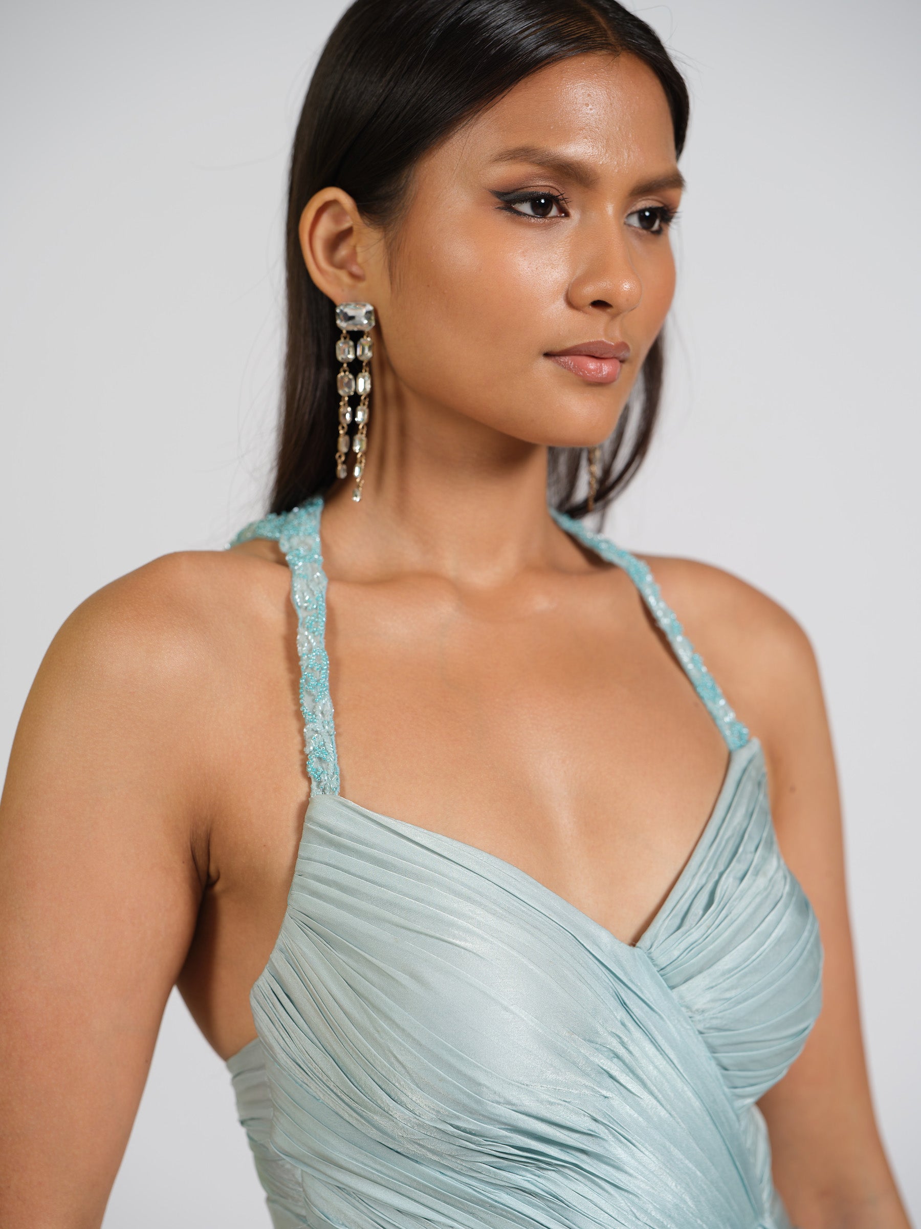 Ice Blue Lure Overlap Drape Gown With Embellished Halter Straps