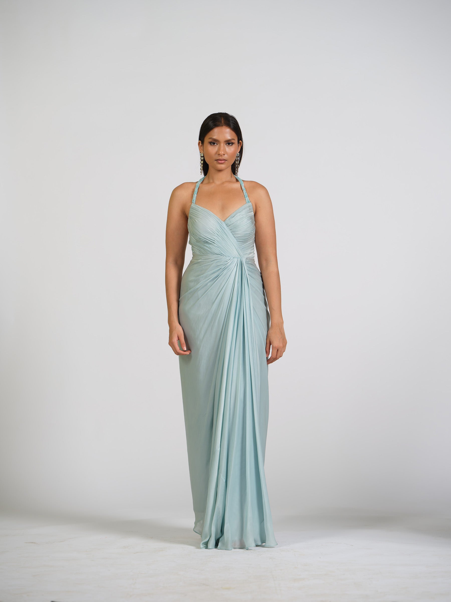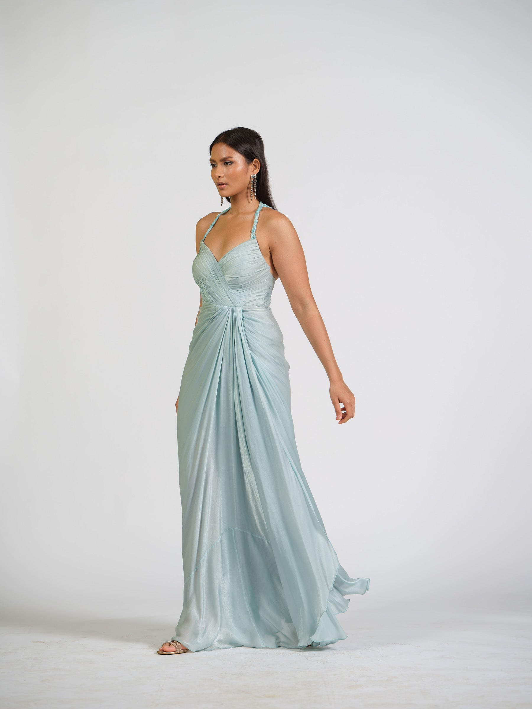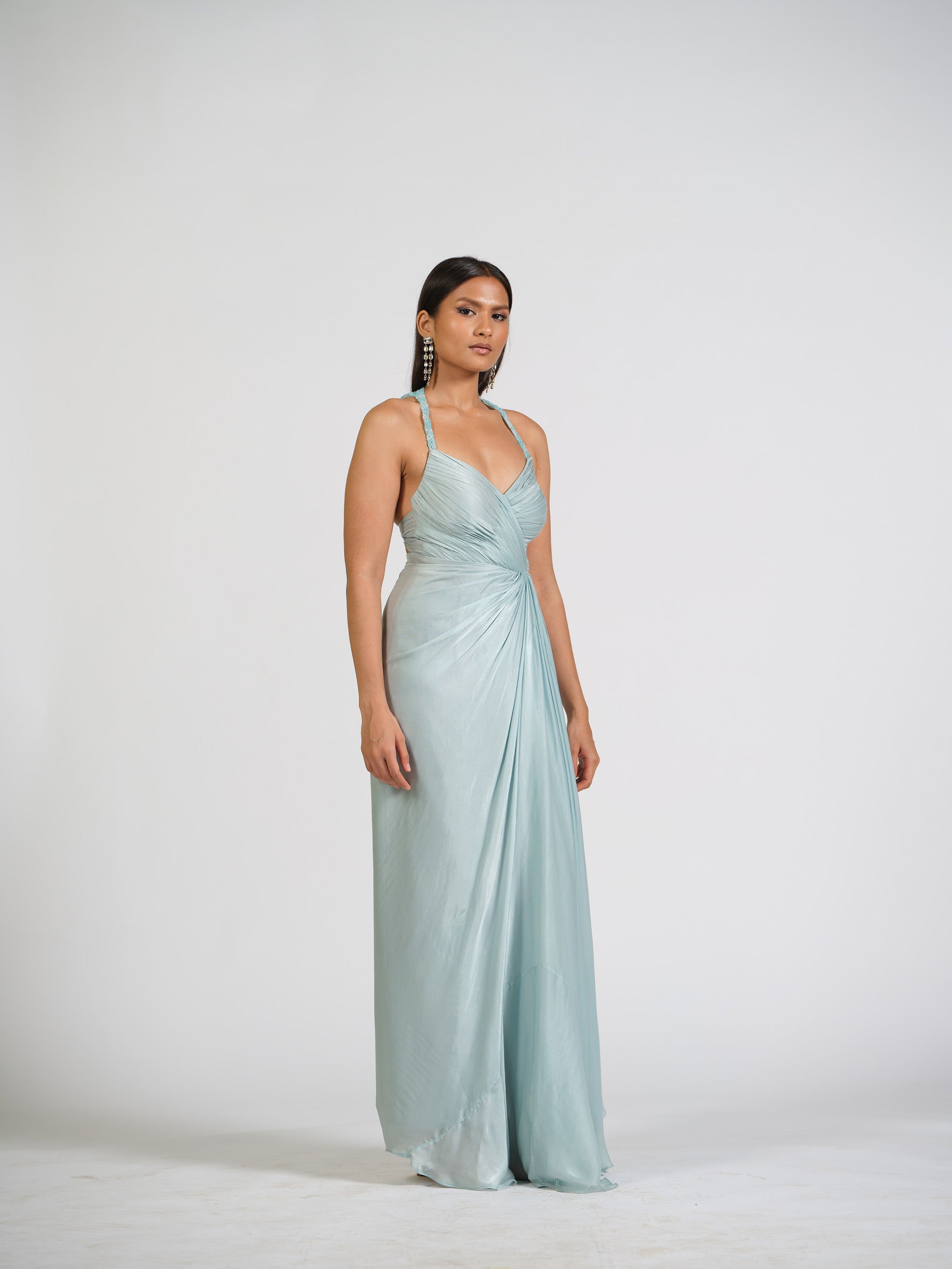 Ice Blue Lure Overlap Drape Gown With Embellished Halter Straps