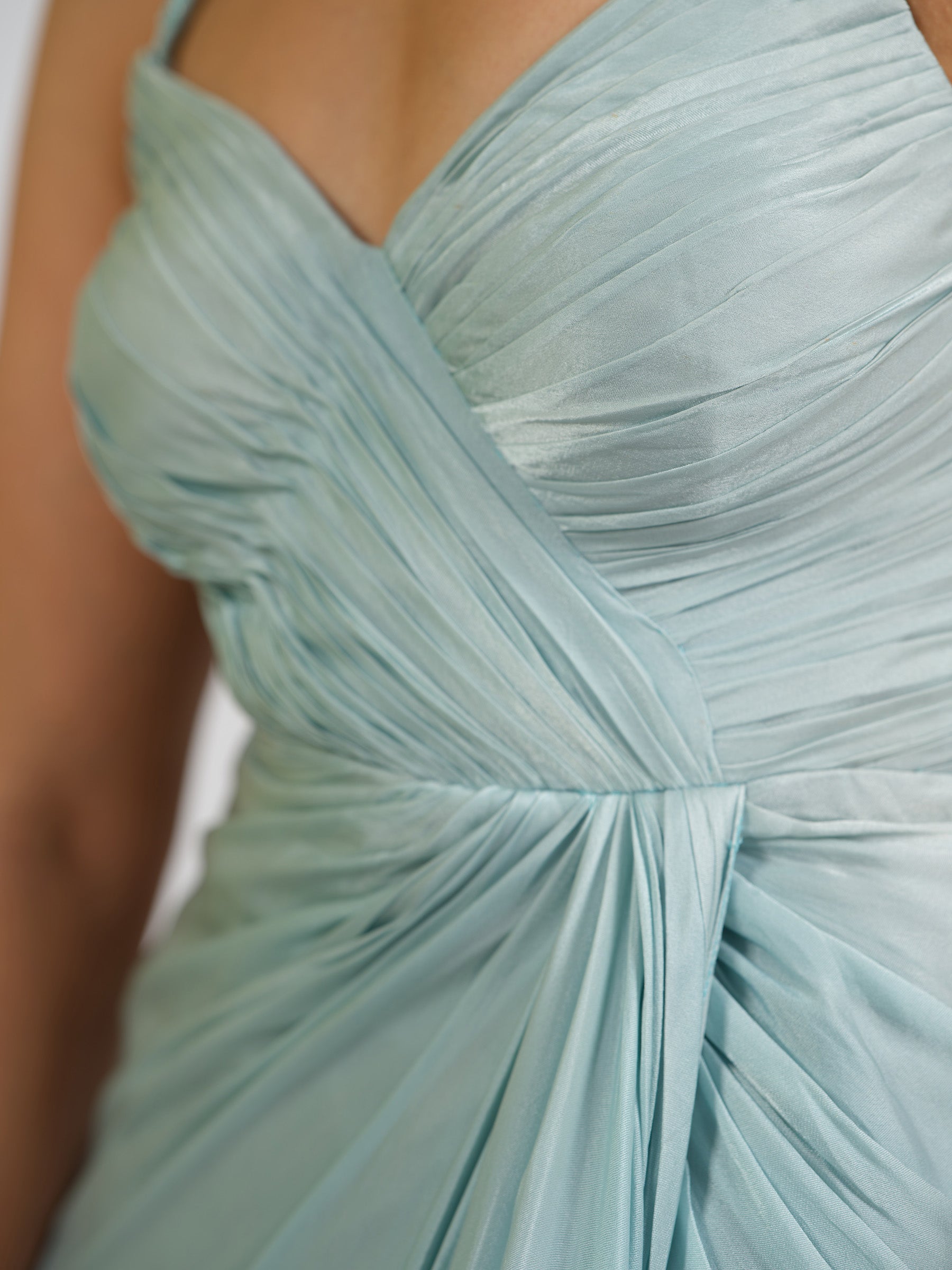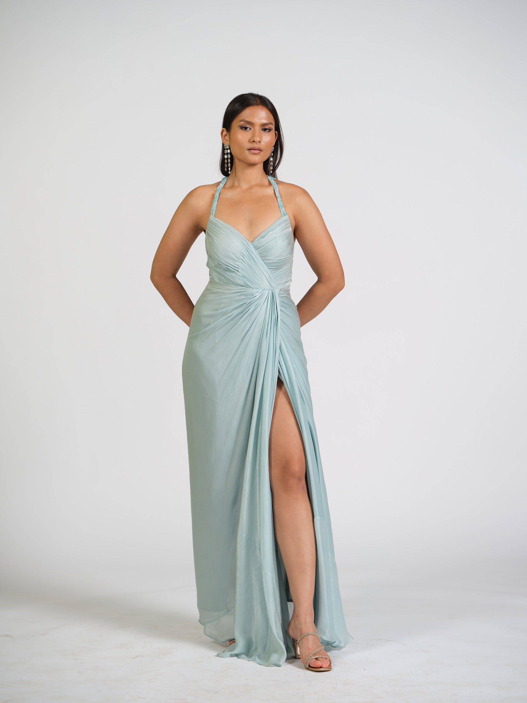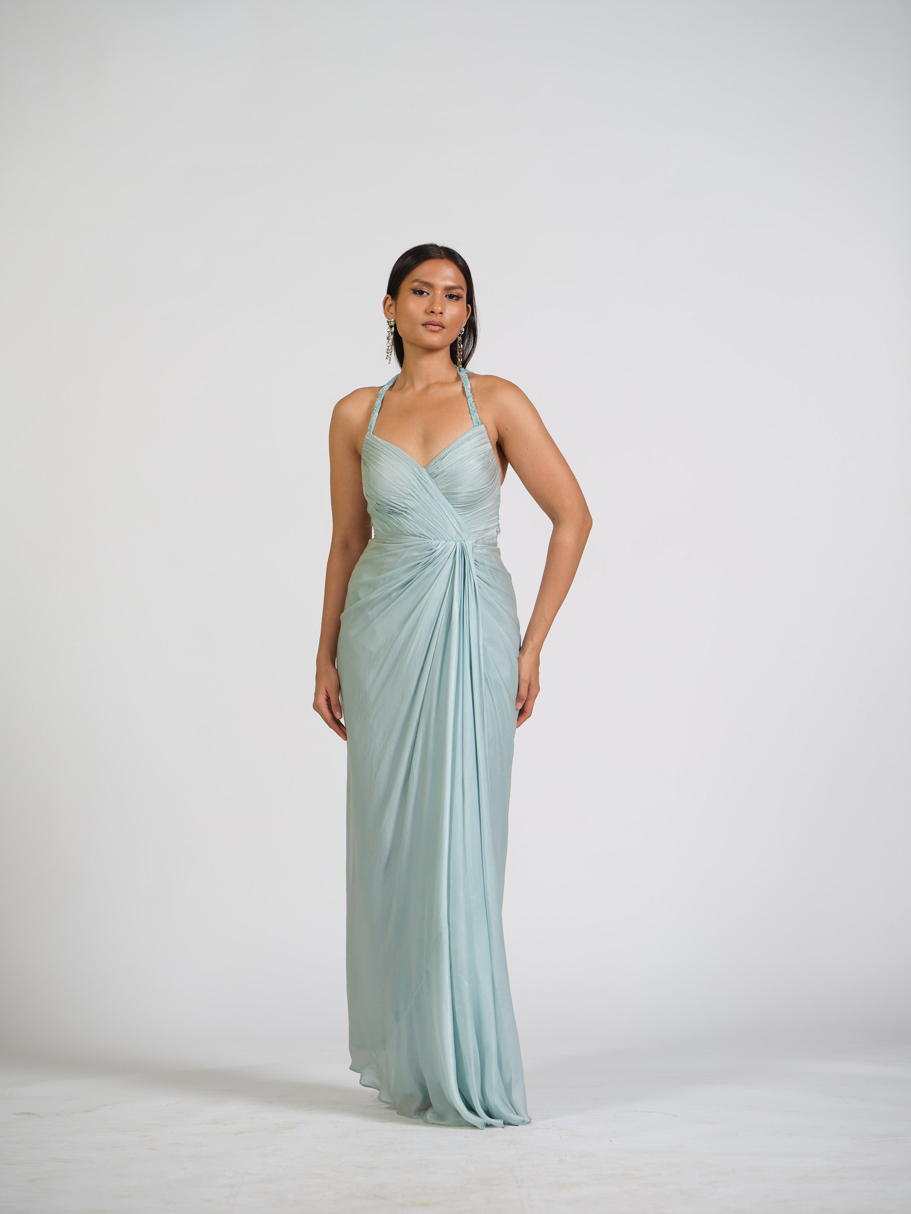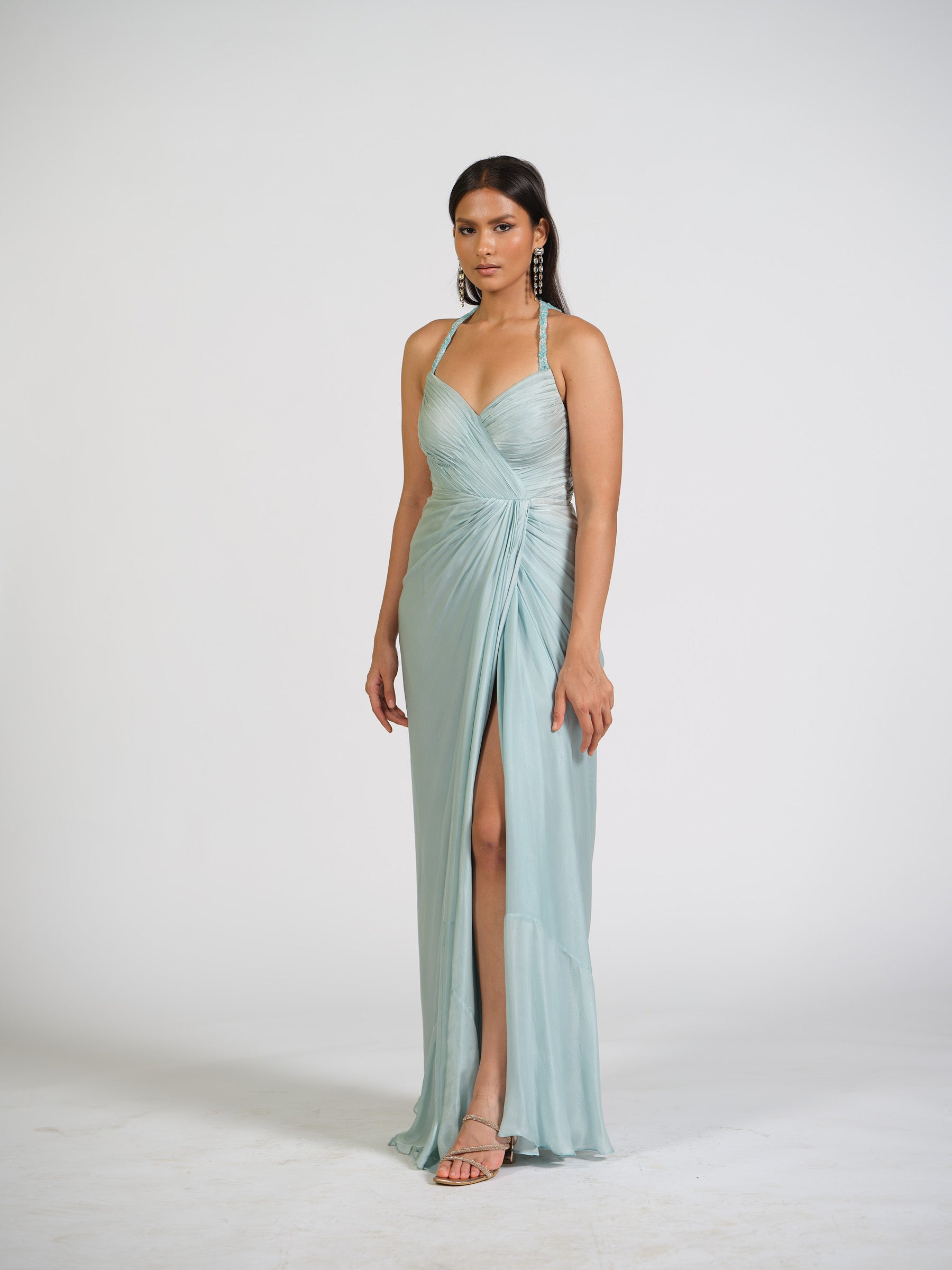 Ice Blue Lure Overlap Drape Gown With Embellished Halter Straps