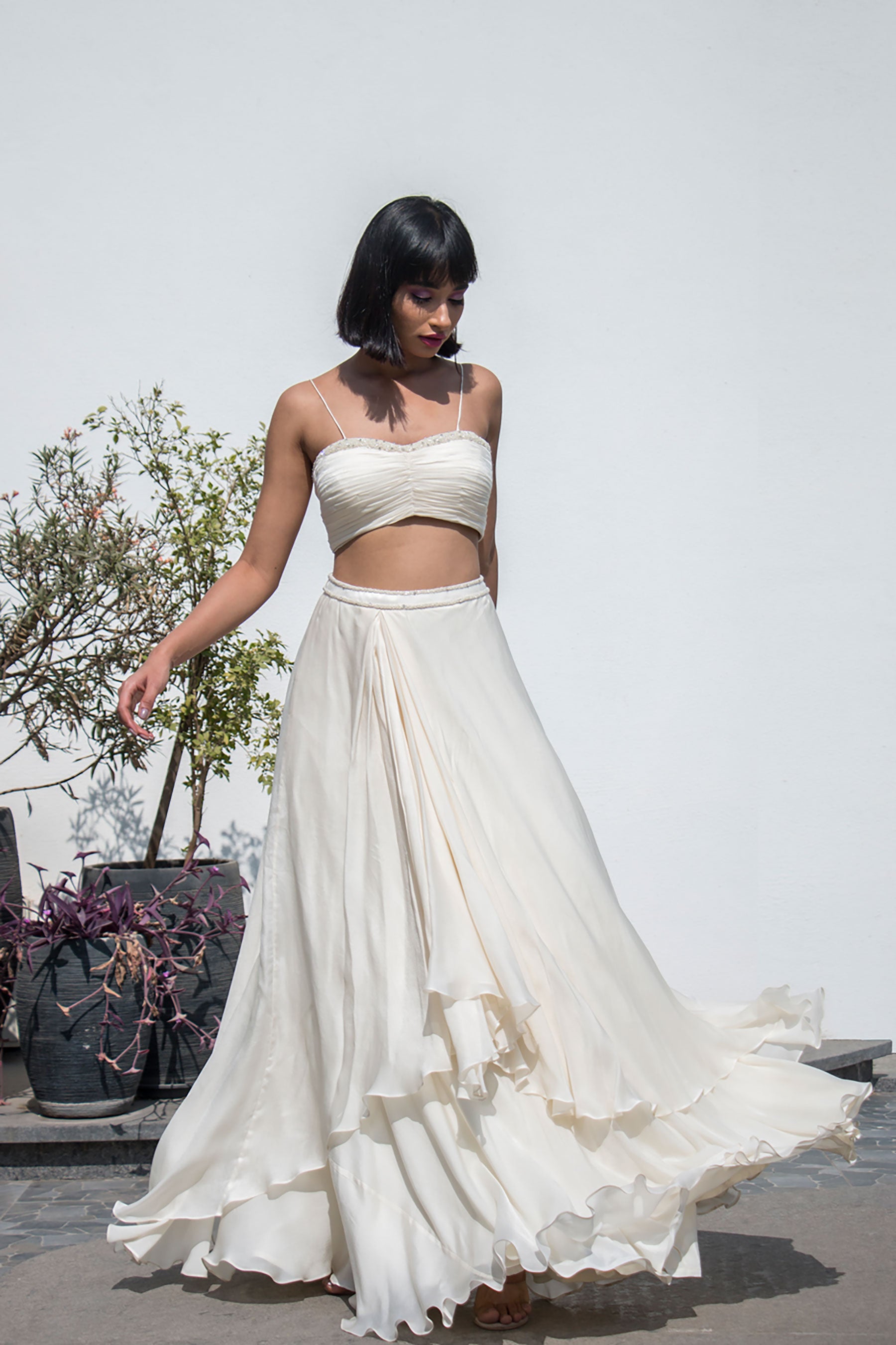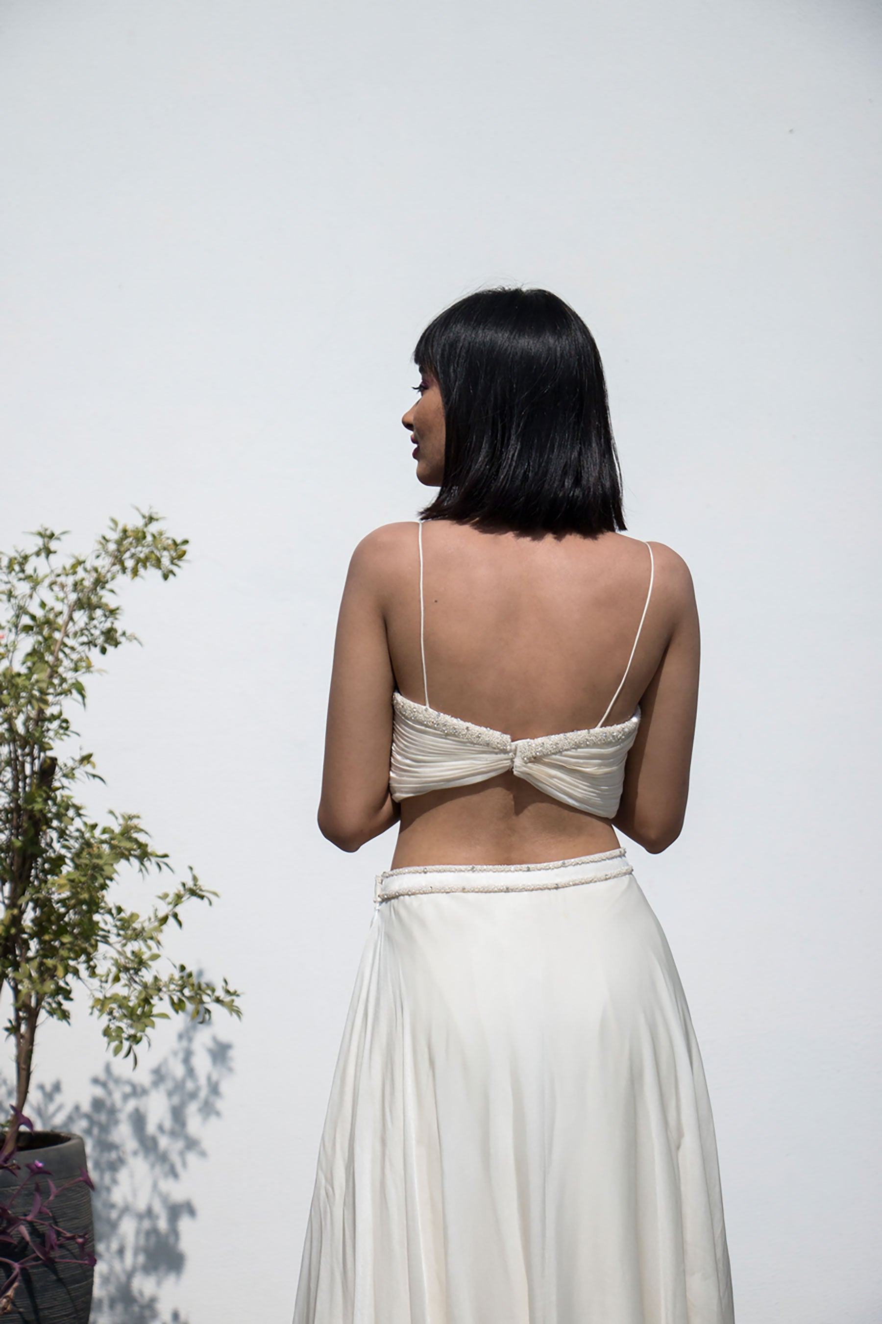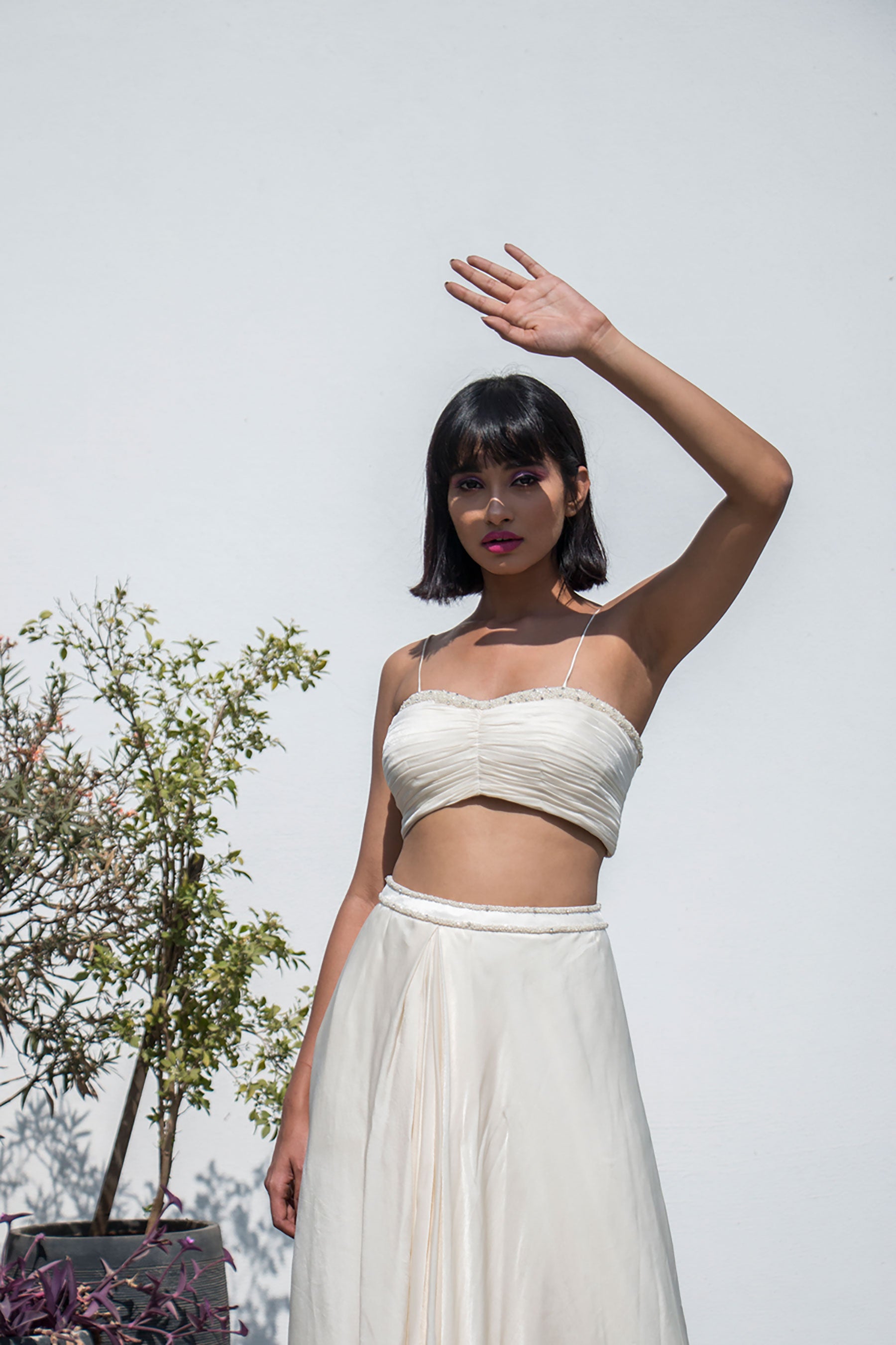 - pleated sweetheart neck line bustier with delicate embroidery on the edge on the neckline & straps